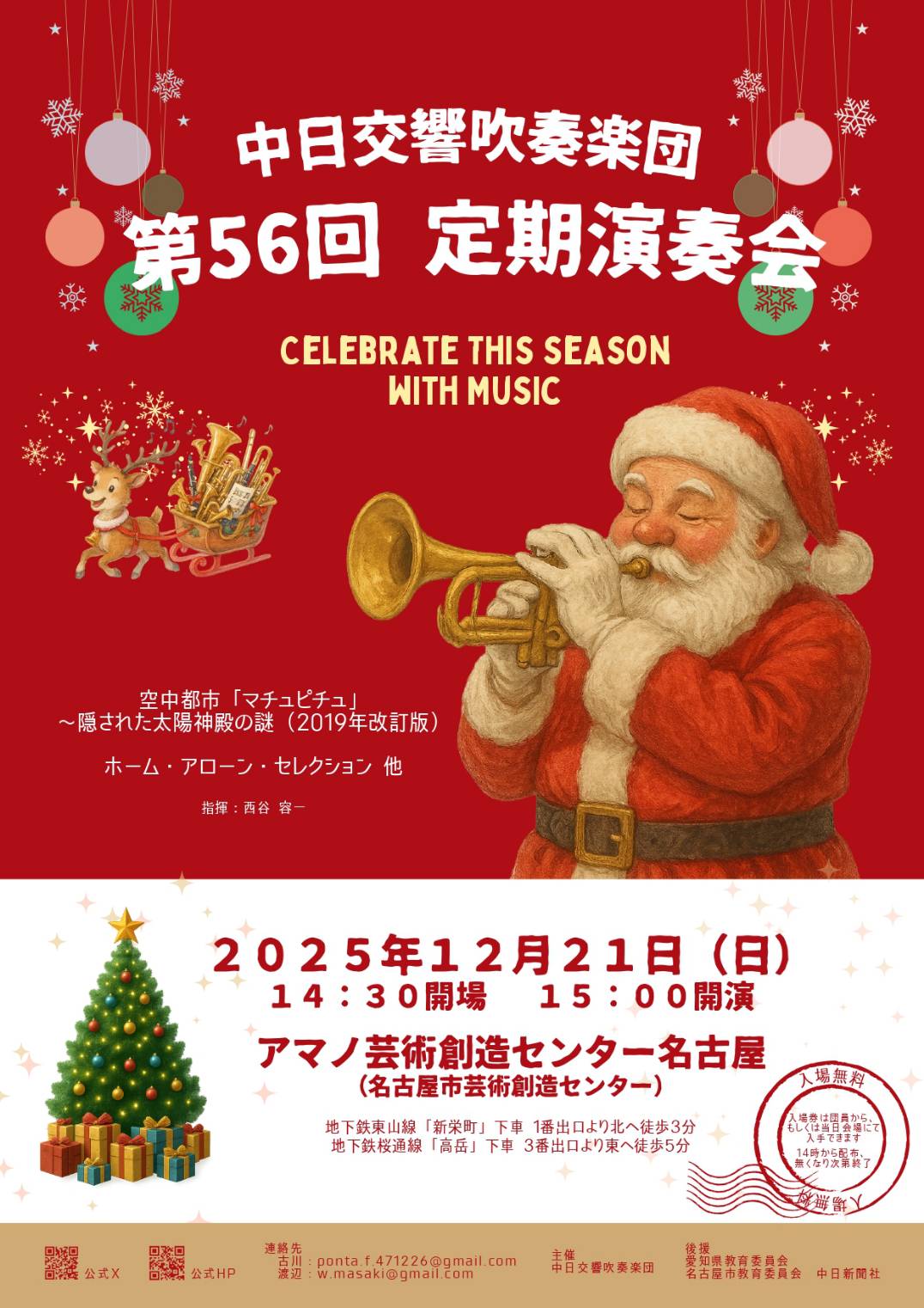 第56回定期演奏会を、2025年12月21日(日)に開催いたします。入場無料ですが、入場券が必要です。 ⇒団員から入手いただくか、当日会場で14時から配布します。